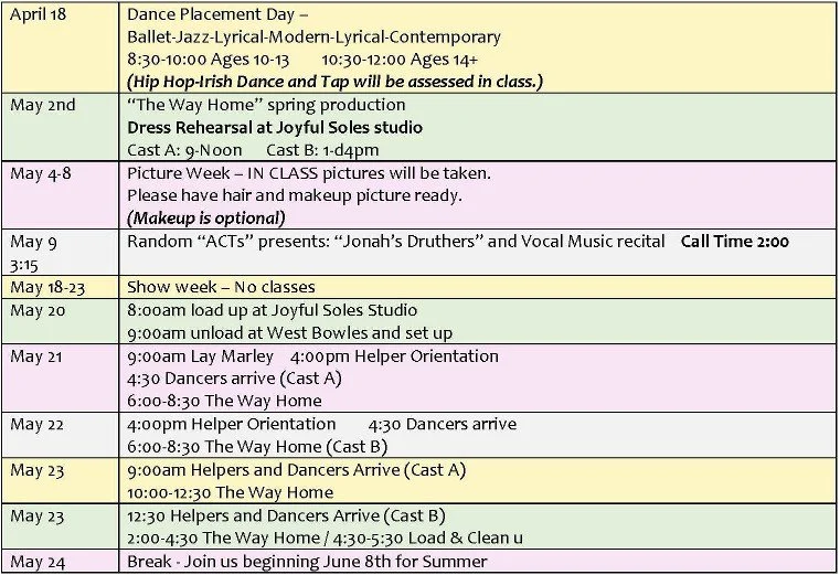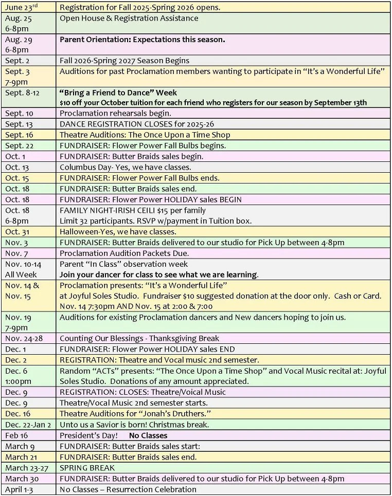 Season CalendarThis is our plan for the whole season including auditions, performances, parent orientation, fundraisers, and holiday breaks. Check out our list of important dates below.